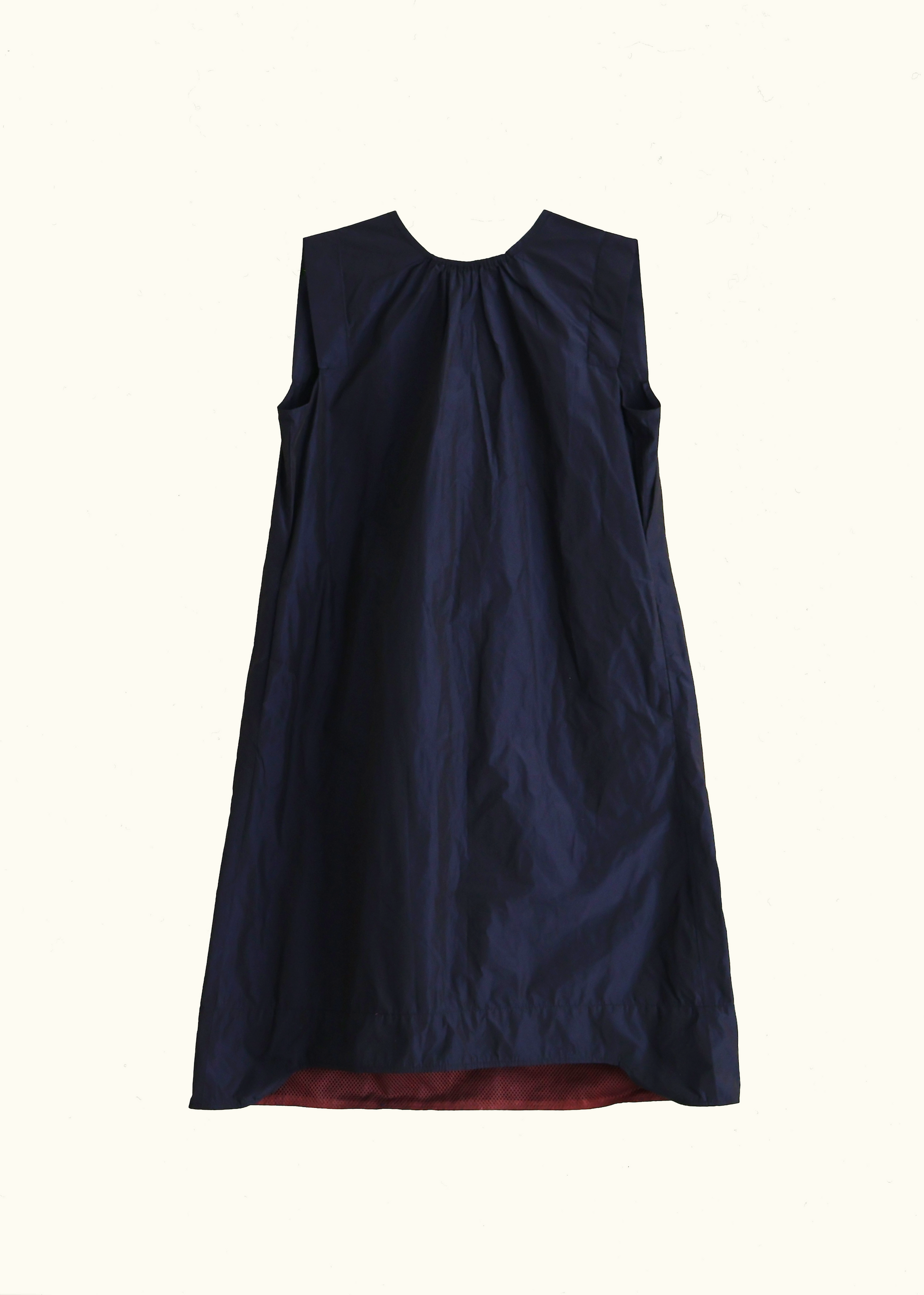 From a modern space age dream. This A-line dress by Hussein Chalayan shimmers in iridescent blue with unexpected red netting detail. Thoughtful, refined, and unmistakably his. In excellent condition. It even has pockets!